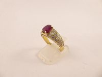Bague bandeau en or 750 mil. sertie d'un rubis chauffé taille coussin épaulé de pavage de diamants brillantés. (Rubis égrisé, monture accidentée, une griffe cassée). (TDD : 51). 4,4 g.