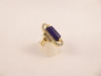 Bague moderniste ajourée deux ors 750 mil. sertie de lapis-lazuli et diamants taille 8/8. (Petites égrisures). (TDD : 49). 7,7 g. brut
