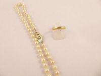 Collier d'un rang de perles de culture, fermoir menottes en or 750 mil. (Longueur : 40 cm environ). Alliance en or 750 mil. (chiffrée). (TDD : 57). 20,4 g. brut