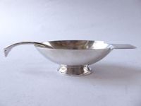 CHRISTIAN FJERDINGSTAD (1891-1968) pour CHRISTOFLE-GALLIA : saucière Cygne sur piédouche à vaguelette et sa cuiller crantée col de cygne en métal argenté. Marque Gallia (sur la base de la saucière) et poinçons de fabricant Christofle au cavalier d’échec. Numérotée 0422 sur la base. Rayures d’usage. L. 20 cm. H. 6 cm. P. 10 cm.
