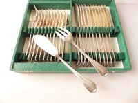 RAVINET D’ENFERT, XXe siècle : 12 couverts à poisson en métal argenté, modèle filet à spatule trilobée. Signés. Poinçon de maître. Ecrin d’origine signé. Très bel état.