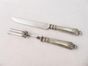 Service à découper à manches en argent fourré 925 mil. modèle à pans et décor guilloché avec agrafes de feuillage, palmettes et fleurons. Cartouche central non chiffré. Travail de la fin du XIXe siècle vers 1880. Minerve 1er titre. Poids brut : 291.6 g. Lame inox repoli. Légères rayures. L. 28 cm et 32 cm. Très bel état général.