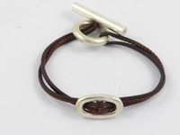 HERMES Paris made in France. Bracelet "Skipper" en argent 925 mil. sur un lien en cuir agneau ébène, fermoir bâtonnets. Poids brut total : 16,5 g. (Longueur : 17 cm).