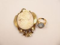 Bague en or 750 mil ornée d'une pierre imitation (TDD : 58). (Egrisures). 9,3 g. + Broche en argent 800 mil ornée d'un camée corail à décor de jeune femme. Epingle en métal. (Défectueux). Poids brut : 41,8 g.