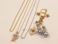 Lot 2 ors 750 mil comprenant 3 colliers dont un retenant un pendentif 2 ors 750 mil (diamants tailles brillant et 8/8) (noué, anneau au fermoir défectueux) (longueur : 37 et 42 cm environ), 1 pendentif "coeur" GUY LAROCHE serti de diamants taille brillant et une paire de pendants d'oreilles (diamants taille brillant et perles de culture grise). 4 débris en or 750 mil. (Pierres imitation). (2,9 g.). Poids total : 22 g.