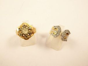 Bague en or gris 750 mil. centrée d'une améthyste taille émeraude, épaulée de 2 rouleaux sertis de diamants brillantés et d'améthystes cabochon (TDD : 54) (serti défectueux, égrisures) (dimensions pierre : 17 x 13 mm) + Collier en or gris 750 mil. composé d'une fine chaîne retenant un pendentif (perle de culture grise de 8,7 mm, diamants brillantés) (longueur : 46 cm). 17,4 g. brut