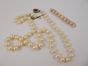 Collier d'un rang de perles de culture, fermoir en or 750 mil. (rubis, diamants taille 8/8), broche barrette en or 750 mil ornée de perles de culture d'eau douce. 54,5 g. brut