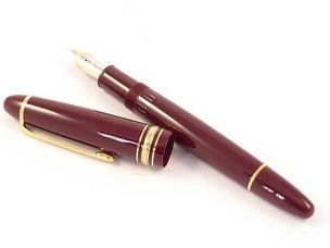 120 / 180 €Stylo-plume MONTBLANC Meisterstück en résine bordeaux et métal doré (plume en or 585 mil exempté art 524 bis du CGI, al c). 25,4 g. brut