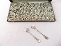 BOULENGER, fin du XIXe siècle : suite de 12 fourchettes à huîtres en argent 950 mil., modèle baguette à revers de la spatule gravé d’une coquille et chiffré LP. Minerve 1er titre et poinçon de maître d’Adolphe BOULENGER (actif 1876-1899). Ecrin monogrammé LP. Poids : 280.9 g. Très bel état. L. 13.5 cm.