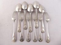 CHARLES ANDRE (actif 1882-1887) pour H. PFENNINGER, fin du XIXe siècle : suite de 6 grandes fourchettes et 5 grandes cuillers en argent 800 mil., modèle baguette à médaillon feuillagé. Non chiffrées. Fin du XIXe siècle. Mercure 2e titre pour l’exportation et poinçons allemands. Poids : 770.4 g. Rayures et usures d’usage. Charles André est un orfèvre des Vosges.+ lot en métal argenté du XIXe siècle : boîte à cigarettes « Rouget de l’Isle chantant la Marseillaise » (usures, intérieur bois) et moulin à poivre BOULENGER (déformations et oxydations, en l’état).