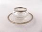 Confiturier ou sucrier sur une soucoupe en cristal gravé et argent 950 mil. Décor de lauriers ou d’entrelacs de filets rubanés. Vers 1900. Minerve 1er titre. Poids brut total : 418 g. Rayures d’usage. Bel état. Diam de la soucoupe : 16 cm.