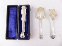 Lot en argent 950 mil. Minerve 1er titre :- 1 couvert filet XIXe après 1838 de pensionnaire. Usures. L. 20 et 19 cm.- 1 pince à sucre violonée ciselée à pieds patte de lion et nœud gordien par Philippe BERTHIER (actif 1841-1851). Chiffrée GC en lettres gothiques. Ecrin d’origine. - 2 pièces à bonbons à décor Art Nouveau végétal repercé bicolore par CHARLES MURAT (actif après 1897). Ecrin d’origine. - 1 petite pique à deux dents, la tige à pampres de vigne par A. VAGUER.Poids total : 214.5 g.
