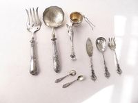 Lot en argent 950 mil. travail de la fin du XIXe siècle-début du XXe siècle, Minerve 1er titre :- Pince à sucre à pieds griffe et médaillons non chiffrés. Ecrin.- 1 pelle à fraises de style guirlande à manche fourré argent, le haut en métal argenté à décor rocaille au rongé.- 1 fourchette de service à poisson par PUIFORCAT à manche argent fourré rocaille à guirlande 1900 et le haut métal argenté gravé. Chiffrée MD.- 3 pièces à mignardises à rocaille déchiquetée chiffrées AB.- 2 pelles à sel style Empire.- 1 passe-thé à godrons, le passant et l’anse poinçonnés au crabe.Rayures d’usage. Poids brut total : 347.2 g dont 136.7 g net.