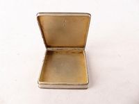 TOURON, début du XXe siècle : boîte à pilules en argent 950 mil. et vermeil de forme carrée à décor mouluré de bandes filetées, le monogramme rond MT en applique en or. Signée. Poinçons de petite garantie pour les menus ouvrages tête de sanglier-aigle. Poids brut : 49.7 g. Dim. 1 cm x 5 cm. Bel état.