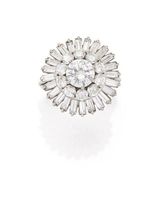 Bague en or gris 750°/oo et platine 850°/oo ornée au centre d'un diamant rond de taille brillant dans un double entourage de diamants ronds et baguettes formant jupe.Tour de doigt : 54Poids brut : 9.5 gAccompagnée d'un pli d'examen du L.F.G. n° BD 017285/7 du 09/02/2018 précisant : Masse : 1.18 ctCouleur : GPureté : SI1Fluorescence : aucune Dimensions : 6.91-6.98 x 4.06 mm