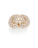 BOUCHERON. Bague en or jaune 750°/oo de forme bombée ornée de trois pavages de diamants ronds de taille brillant.Signée et numérotée (52190)(Manque à un diamant)Tour de doigt : 53Poids brut : 11.1 g