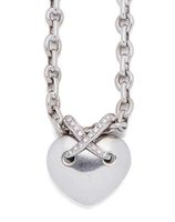 CHAUMET Paris. Collier articulé en or gris 750°/oo, les maillons de forme ronde et ovale alternés retenant en pendentif un motif "cœur" également en or gris 750°/oo, la bélière ornée de deux lignes de diamants ronds de taille brillant.Signé et numéroté (334671 et 333130)Longueur : 41 cmPoids brut : 50.9 g