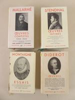 BIBLIOTHEQUE DE LA PLEIADE (4 volumes) : - MONTAIGNE, Michel de, "Essais", NRF, Gallimard, 1933. In-12, reliure de l'Editeur. - DIDEROT, Denis, "Oeuvres", NRF, Gallimard, 1946. In-12, reliure de l'Editeur. - MALLARME, Stephane, "Oeuvres complètes - Poésie - Prose", NRF, Gallimard, 1945. In-12, reliure de l'Editeur. - STENDHAL, "Oeuvres intimes", NRF, Gallimard, 1955. In-12, reliure de l'Editeur. Avec jaquettes. (Déchirures, pliures, salissures)