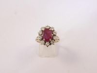 Bague pompadour en or gris 750 mil centrée d'un rubis ovale dans un entourage de diamants taille brillant (égrisures, manque de matière, fêles) (TDD: 55,5). 6,1g