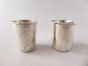 2 timbales non chiffrées en argent 950 mil. :- L’une droite et lisse, le col fileté. XIXe siècle après 1838. Restaurations. Repolie. Poids : 59.4 g. - L’autre tronconique à décor pastillé et ciselé par EDMOND BONNESOEUR (actif 1887-1908). Cartouche feuillagé. Très bel état. Poids : 56.2 g. Minerve 1er titre. Poids total : 115.6 g. H. 7.6 cm.