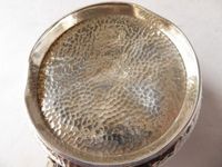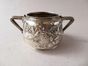 CARDEILHAC, vers 1900 : sucrier rond non couvert à petit ressaut en argent martelé 950 mil. à décor japonisant en repoussé de fleurs, les 2 anses moulurées. Signé. Poinçon de fabricant TETARD et Minerve 1er titre. Poids : 190.4 g. Déformations. L. aux anses : 15 cm. H.7.1 cm.