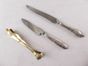Lot de 3 pièces de service XIXe en argent et vermeil :- 1 grand couteau à manche argent fourré 950 mil., décor Néo-Renaissance chiffré M.H2. Minerve 1er titre. La lame acier au lion.- 1 pince à sucre en vermeil 800 mil. à pieds griffe et culot bouton, chiffre gothique. Minerve 2e titre. Poids net : 39.4 g. Petit accident et déformations. - 1 couteau à fromage argent fourré 950 mil. lame acier gravure Art Nouveau en rongé. Minerve 1er titre. Poinçon de maître probable DOUTRE-ROUSSEL. Non chiffré. Légères déformations. Bel état. Poids total : 156.2 g.