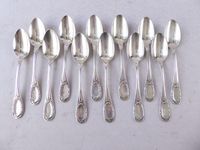 TETARD Frères (actif après 1903) : suite de 12 cuillers à café en argent 950 mil. modèle à canaux et médaillons de lauriers. Minerve 1er titre et poinçon de maître. Poids : 314.6 g. Non chiffrées. Très bel état. Au modèle des lots 157 et 158.