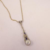 Collier en or gris 750 mil retenant un motif en platine 850 mil (perle de culture, diamants TA, diamants 8/8, roses, saphirs). (Longueur : 41 cm). 5,5 g.
