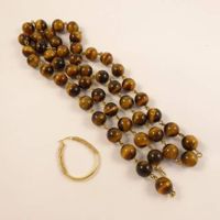 Sautoir en or 750 mil. et boules d'oeil de tigre. (Longueur : 90 cm environ). (Fêles). 149 g. brut. Boucle d'oreille en or 750 mil. 1,9 g.