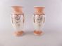 Paire de vases balustres en verre opalin blanc et saumon à col évasé et piédouche rond, décor brun et violet de bouquets de fleurs et lambrequins sur rehauts d’or. XIXe siècle. H. 22.5 cm. Usures d’usage à la dorure et micro-rayures.