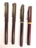 4 stylo-plumes dont 2 VISOR PEN en résine noire et métal doré (plumes en or 750 mil exemptées art 524 bis du CGI al c), 1 SHEAFFER et 1 sans marque (plume en métal). (Très usés). Poids plumes or : 19,8 g. brut