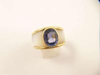 Bague bandeau en or 750 mil. centrée d'un saphir ovale de 2 carats environ en serti clos, épaulé de nacre blanche. (TDD : 59). (Egrisures). 17,1 g.