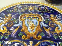GIEN - Lot de 3 pièces en faïence fine à décor d'Amours victorieux dans des cartouches et de grotesques polychromes sur fond bleu nuit dans le goût de la Renaissance comprenant : - un dessous de plat carré avec tampon noir de GIEN 1938-1960 (dimensions : 25 x 25 cm.) ; - un pichet et un plat avec tampon bleu nuit à partir de 1984 (hauteur du pichet : 27 cm; diamètre du plat : 25,5 cm.)