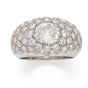 Bague en platine ornée au centre d'un diamant ovale de taille ancienne dans un pavage de diamants ronds de taille brillant. (Manques au diamant principal). Tour de doigt : 53. Poids brut : 10,4 g. Poids approximatif calculé du diamant : 1,00/1,30 ct