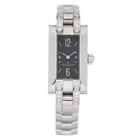 JAEGER LeCOULTRE, Idéale. Montre de dame rectangulaire (30,2x17 mm) en acier. Lunette biseautée. Fond à vis. Cadran gris ardoise, deux chiffres arabes et deux plots ronds en applique, 8 index bâtons fins, peints. Mouvement quartz. Bracelet acier fixé sur la boite par deux brancards de chaque côté sertis de diamants. Fermoir double dépliant en acier. Référence 460.8.08. N° Série : 236467. Poignet : 17 cm. Boîte, écrin, livret.