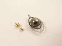 Pendentif en or gris 750 mil serti d'une perle de culture grise et de diamants brillantés blancs et noirs. Bouton d'oreille en or 375 mil (diamant brillanté). 3,9 g.