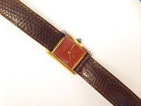 Montre-bracelet must de CARTIER "Tank" en vermeil 925 mil., cadran bordeaux muet, mouvement mécanique, bracelet en cuir d'origine, boucle ardillon d'origine en métal, signée et numérotée (usures) (dimensions : 26 x 20 mm). 22,5 g. brut