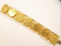 Bracelet manchette en or 750 mil. à maillons articulés retenant chacun un souverain (7 au total). (Longueur : 18,5 cm). 119,8 g.