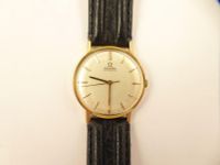 Montre-bracelet OMEGA en métal doré, boîtier rond, cadran crème, index bâtons appliqués, mouvement automatique, bracelet en cuir noir, boucle ardillon en acier (fond de boîte en acier) (usures) (diamètre : 33 mm)
