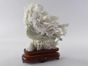 CHINE : Sujet en pierre décorative sculptée blanche et verte figurant une Guanyin aux voiles, éventail et épée. Avec socle en bois. Travail du XXème siècle. Hauteur sans socle : 16,5 cm ; Hauteur avec socle : 21 cm. (Eclats, manques)