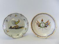 NEVERS : Deux assiettes en faïence à bords contournés à décor patriotique polychrome, l'une à décor d'un coq surmontant un canon, la seconde avec l'inscription "W la montage" entourée d'un décor de canons, piques et bonnet phrygien. Fin du XVIIIème siècle, Epoque révolutionnaire. Diamètres : 22,5 et 23 cm. (Eclats, fêles, restaurations)