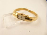 Bracelet-montre de dame BAUME & MERCIER en or 750 mil, petit boîtier rectangulaire, cadran champagne à chiffres arabes et index doé, mouvement mécanique, sur bracelet rigide ouvrant. 18,5 g. brut. (Déformations).