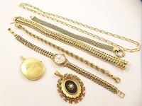 Lot en or 750 mil : 3 bracelets (longueurs : 21, 19 et 18,5 cm environ), (déformations), bracelet-montre de dame LIP (mouvement mécanique) (longueur : 19 cm environ), collier (longueur : 51 cm), 2 pendentifs dont un médaillon (onyx, perle de culture, pierres imitation). 121,5 g. brut