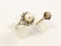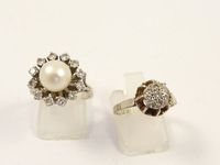 2 bagues en or gris 750 mil dont 1 fleur centrée d'une perle de culture entourée de diamants (TDD : 53) et 1 à chaton rond orné de diamants 8/8 (TDD : 53). 8,4 g. brut