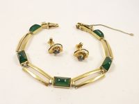 Bracelet en or 750 mil à maillons rectangulaires et intercalaires ornés d'une pierre décorative en pain de sucre (longueur : 17 cms) (chaînette de sécurité métal). Paire de boucles d'oreilles en or 375 mil ornées d'un saphir poire. 15,9 g. brut