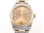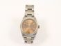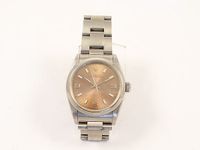 Bracelet-montre de dame en acier, boîtier rond, cadran cuivré à index bâton et chiffres arabes, tour de bras oyster acier, ROLEX "Oyster perpetual", mouvement automatique.