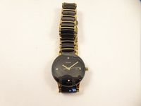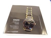 Bracelet-montre de dame en acier, métal doré et céramique, boîtier rond, cadran noir à index diamants et guiche dateur, tour de bras à maillons céramique et métal doré, RADO "Centrix diamonds", mouvement quartz, dans boîte, sa surboîte, son livret, sa garantie et un maillons en sus.