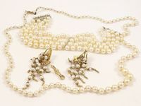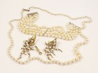 Collier de perles de culture en chute, fermoir en or 750 mil, bracelet de 4 rangs de perles de culture, fermoir argent 800 mil orné de perles de culture (longueur : 19 cms), paire de boucles d'oreilles en or 750 mil ornées de pampilles en perles de culture, mousqueton en or 750 mil. 67,4 g.