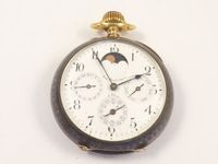 Montre de gousset en or 750 mil et argent niéllé 800 mil, chiffré, cadran blanc à chiffres arabes et 4 compteurs secondaires, jour, date, mois et petite seconde, phases de lune, boussole dans la couronne, mouvement mécanique, Ecole Nationale d'horlogerie de Cluses. 158,6 g. brut