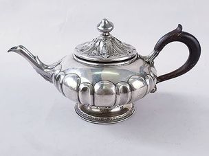 150 / 200 €MARTIAL FRAY, actif 1849-c.1861 : théière en argent 950 mil. de forme toupie à piédouche rond mouluré, le corps à décor de grosses côtes torses et le couvercle doublé d'un chapeau à feuilles de nénuphars ou Ginko. Anse volute en bois exotique. Minerve et poinçon de Maître. Monogramme timbré d'une couronne. Poids brut : 531.7 g. H. 15 cm. Léger enfoncement du frétel toupie.